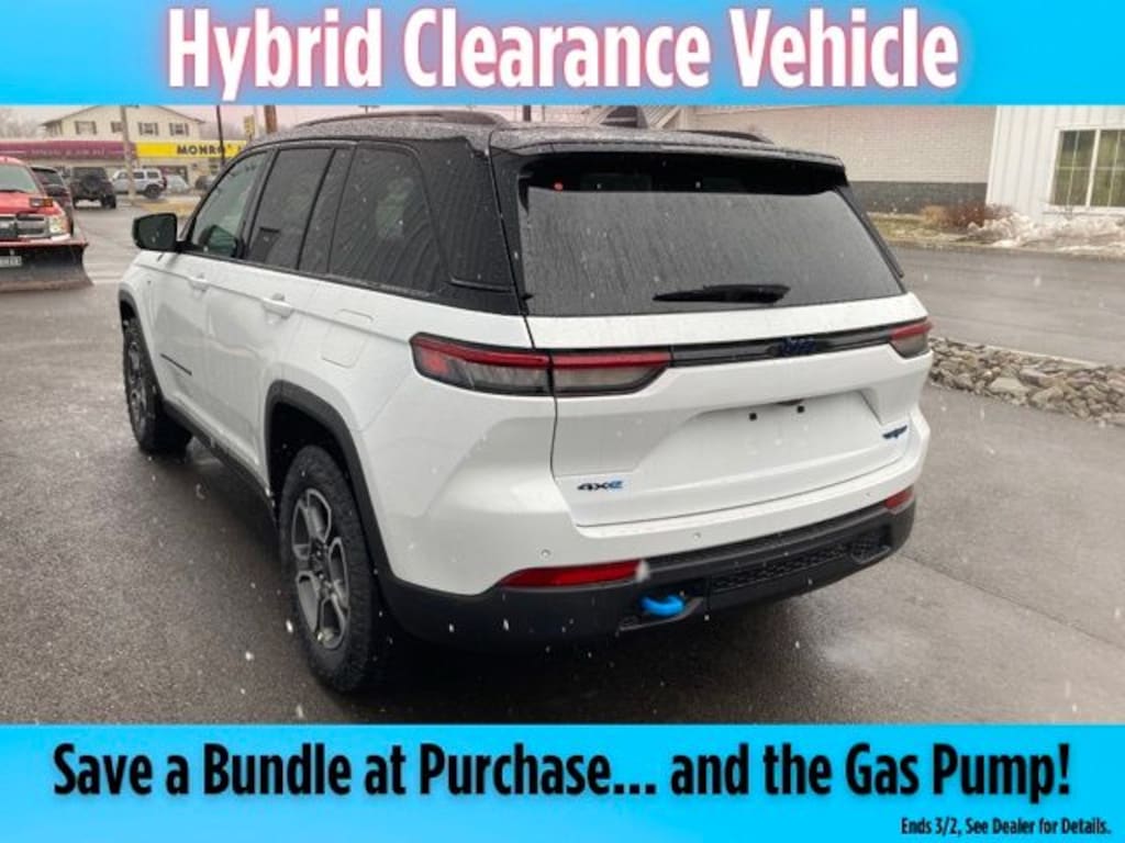 Bright White Clearcoat 2023 Jeep Grand Cherokee Trailhawk 4xe 4WD 8-Speed Automatic 2.0L I4 DOHC Save Time at the Dealership by Customizing your Deal Online!, 2.0L I4 DOHC, 4WD, 10 Speakers, 3.70 Rear Axle Ratio, 4-Wheel Disc Brakes, ABS brakes, Adaptive suspension, Air Conditioning, Alloy wheels, AM/FM radio: SiriusXM with 360L, Anti-whiplash front head restraints, Audio memory, Auto High-beam Headlights, Auto-dimming door mirrors, Auto-dimming Rear-View mirror, Auto-leveling suspension, Automatic temperature control, Brake assist, Bumpers: body-color, Capri Leather/Suede Seats, Compass, Delay-off headlights, Driver door bin, Driver vanity mirror, Dual front impact airbags, Dual front side impact airbags, Electronic Stability Control, Four wheel independent suspension, Front anti-roll bar, Front Bucket Seats, Front Center Armrest w/Storage, Front dual zone A/C, Front fog lights, Front License Plate Bracket, Front reading lights, Fully automatic headlights, Garage door transmitter, Heated door mirrors, Heated front seats, Heated rear seats, Heated steering wheel, Heavy Duty Suspension, Illuminated entry, Knee airbag, Leather Shift Knob, Low tire pressure warning, Manufacturer's Statement of Origin (DISC), Memory seat, Navigation System, Occupant sensing airbag, Outside temperature display, Overhead airbag, Overhead console, Panic alarm, Passenger door bin, Passenger vanity mirror, Power door mirrors, Power driver seat, Power Liftgate, Power passenger seat, Power steering, Power windows, Quick Order Package 27K, Radio data system, Radio: Uconnect 5 Nav w/10.1" Display, Rear anti-roll bar, Rear reading lights, Rear seat center armrest, Rear window defroster, Rear window wiper, Remote keyless entry, Security system, Speed control, Speed-Sensitive Wipers, Split folding rear seat, Spoiler, Steering wheel mounted audio controls, Tachometer, Telescoping steering wheel, Tilt steering wheel, Traction control, Trip computer, Turn signal indicator mirrors, Two Tone Paint Group, Variably intermittent wipers, Ventilated front seats, Voltmeter, Wheels: 18" x 8" Machined Face/Painted Aluminum, 2.0L I4 DOHC, 4WD.