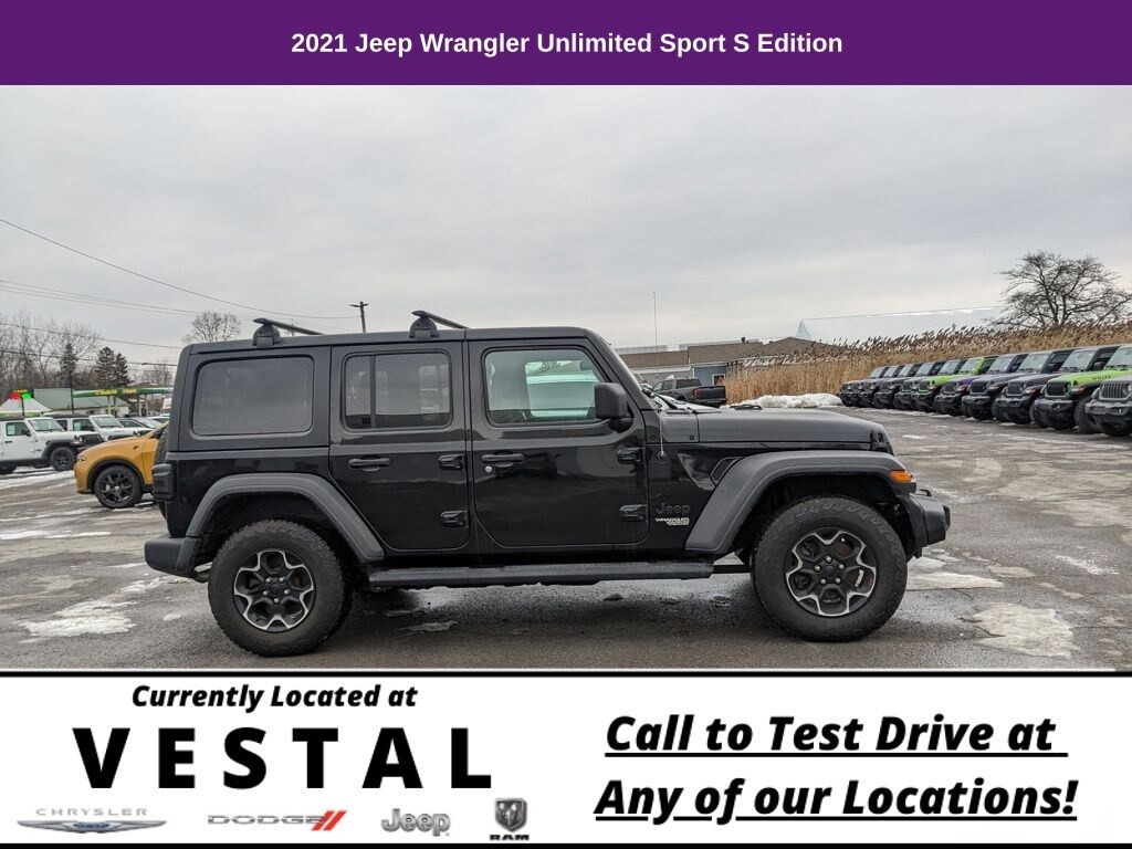 240 Amp Alternator, 3.45 Rear Axle Ratio, 4-Wheel Disc Brakes, 7 & 4 Pin Wiring Harness, 7.0" Touchscreen Display, 700 Amp Maintenance Free Battery, 8 Speakers, ABS brakes, Air Conditioning, Air Conditioning w/Auto Temperature Control, Air Filtering, AM/FM radio, Apple CarPlay, Automatic Headlamps, Aux Battery, Auxiliary Switches, Black 3-Piece Hard Top, Brake assist, Class II Receiver Hitch, Cloth Low-Back Bucket Seats, Cluster 7.0" TFT Color Display, Compass, Deep Tint Sunscreen Windows, Delay-off headlights, Driver door bin, Driver vanity mirror, Dual front impact airbags, Dual front side impact airbags, Electronic Stability Control, For More Info, Call 800-643-2112, Freedom Panel Storage Bag, Front 1-Touch Down Power Windows, Front anti-roll bar, Front Bucket Seats, Front Center Armrest w/Storage, Front fog lights, Front reading lights, Google Android Auto, GPS Antenna Input, Integrated Center Stack Radio, Integrated roll-over protection, Leather Wrapped Steering Wheel, Low tire pressure warning, Manufacturer's Statement of Origin, Mopar Black Tubular Side Steps, No Soft Top, Non-Lock Fuel Cap w/o Discriminator, Normal Duty Suspension, Occupant sensing airbag, Outside temperature display, ParkView Rear Back-Up Camera, Passenger door bin, Passenger vanity mirror, Power Heated Mirrors, Power steering, Quick Order Package 23S Sport S, Radio data system, Radio: Uconnect 3 w/5" Display, Radio: Uconnect 4 w/7" Display, Rear anti-roll bar, Rear reading lights, Rear Window Defroster, Rear Window Wiper/Washer, Remote Keyless Entry, Security Alarm, SiriusXM Radio Service, SiriusXM Satellite Radio, Speed control, Speed Sensitive Power Locks, Split folding rear seat, Sport S, Steering wheel mounted audio controls, Stop-Start Dual Battery System, Sun Visors w/Illuminated Vanity Mirrors, Tachometer, Technology Group, Telescoping steering wheel, Tilt steering wheel, Traction control, Trailer Tow & HD Electrical Group, Trip computer, USB Host Flip, Variably intermittent wipers, Wheels: 17" x 7.5" Black Steel Styled, Wheels: 17" x 7.5" Machined/Painted Black (DISC), Wheels: 17" x 7.5" Tech Silver Aluminum. 2021 Jeep Wrangler 4D Sport Utility Unlimited Sport S Black Clearcoat 4WD 6-Speed Manual 3.6L V6 24V VVT