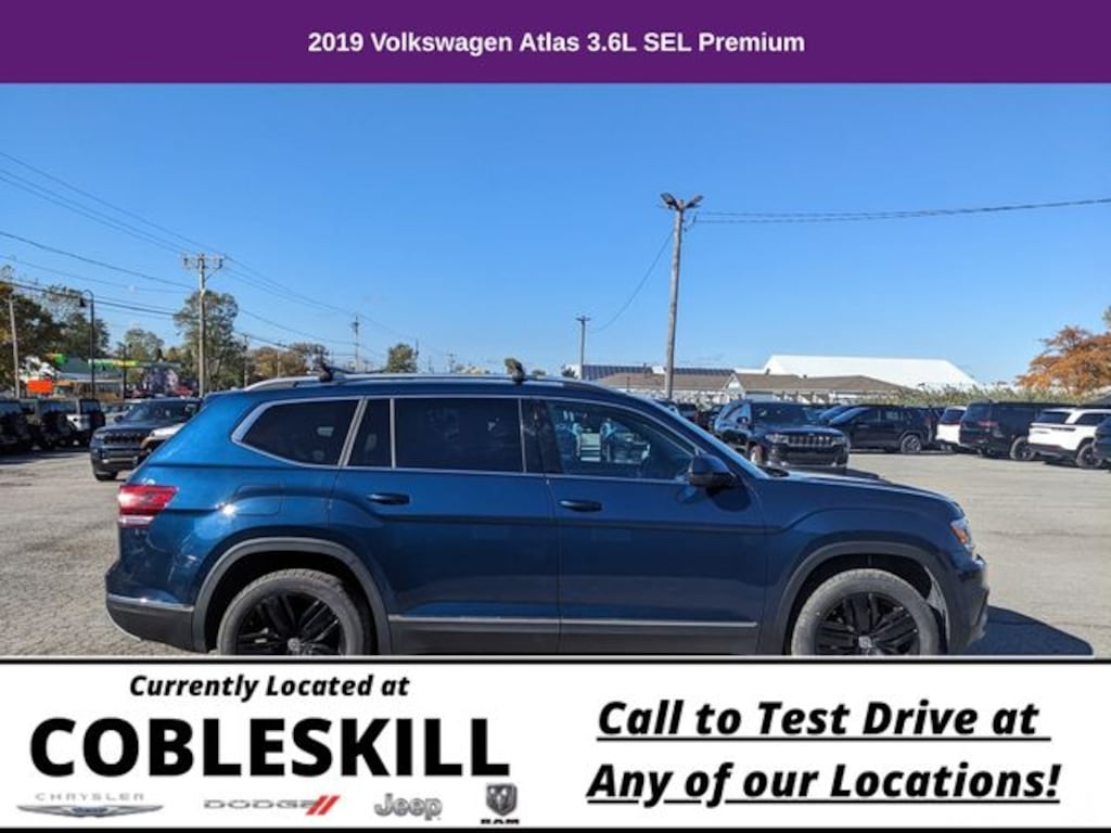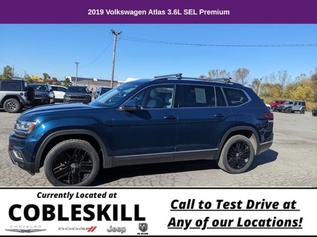 Save Time at the Dealership by Customizing your Deal Online!, 12 Speakers, 3.60 Axle Ratio, 3rd row seats: split-bench, 4-Wheel Disc Brakes, ABS brakes, Active Blind Spot Monitor, Air Conditioning, Alloy wheels, AM/FM radio: SiriusXM, Auto High-beam Headlights, Auto-dimming Rear-View mirror, Automatic temperature control, Brake assist, Bumpers: body-color, Compass, Delay-off headlights, Driver door bin, Driver vanity mirror, Dual front impact airbags, Dual front side impact airbags, Electronic Stability Control, Emergency communication system: VW Car-Net services (capabilities require enrollment or subscription), Forward collision: FCW w/Autonomous Emergency Braking mitigation, Four wheel independent suspension, Front anti-roll bar, Front Bucket Seats, Front Center Armrest, Front dual zone A/C, Front fog lights, Front reading lights, Garage door transmitter: HomeLink, Heated door mirrors, Heated front seats, Heated rear seats, Heated steering wheel, Htd/Actively Ventilated Comfort Front Bucket Seats, Illuminated entry, Low tire pressure warning, Memory seat, Navigation System, Occupant sensing airbag, Outside temperature display, Overhead airbag, Overhead console, Panic alarm, Passenger door bin, Passenger vanity mirror, Perforated Vienna Leather Seating Surfaces, Power door mirrors, Power driver seat, Power Liftgate, Power moonroof, Power passenger seat, Power steering, Power windows, Radio data system, Radio: Discover Media 8.0" Touchscreen w/Nav, Rain sensing wipers, Rear air conditioning, Rear anti-roll bar, Rear audio controls, Rear reading lights, Rear seat center armrest, Rear window defroster, Rear window wiper, Remote CD player, Remote keyless entry, Roof rack: rails only, Security system, Speed control, Speed-sensing steering, Split folding rear seat, Spoiler, Standard Suspension, Steering wheel mounted audio controls, Tachometer, Telescoping steering wheel, Tilt steering wheel, Traction control, Trip computer, Turn signal indicator mirrors, Variably intermittent wipers, Ventilated front seats, Wheels: 20" Silver Triple 5-Spoke Alloy. 2019 Volkswagen Atlas 4D Sport Utility SEL Premium 4Motion AWD 8-Speed Automatic with Tiptronic 3.6L V6 Blue