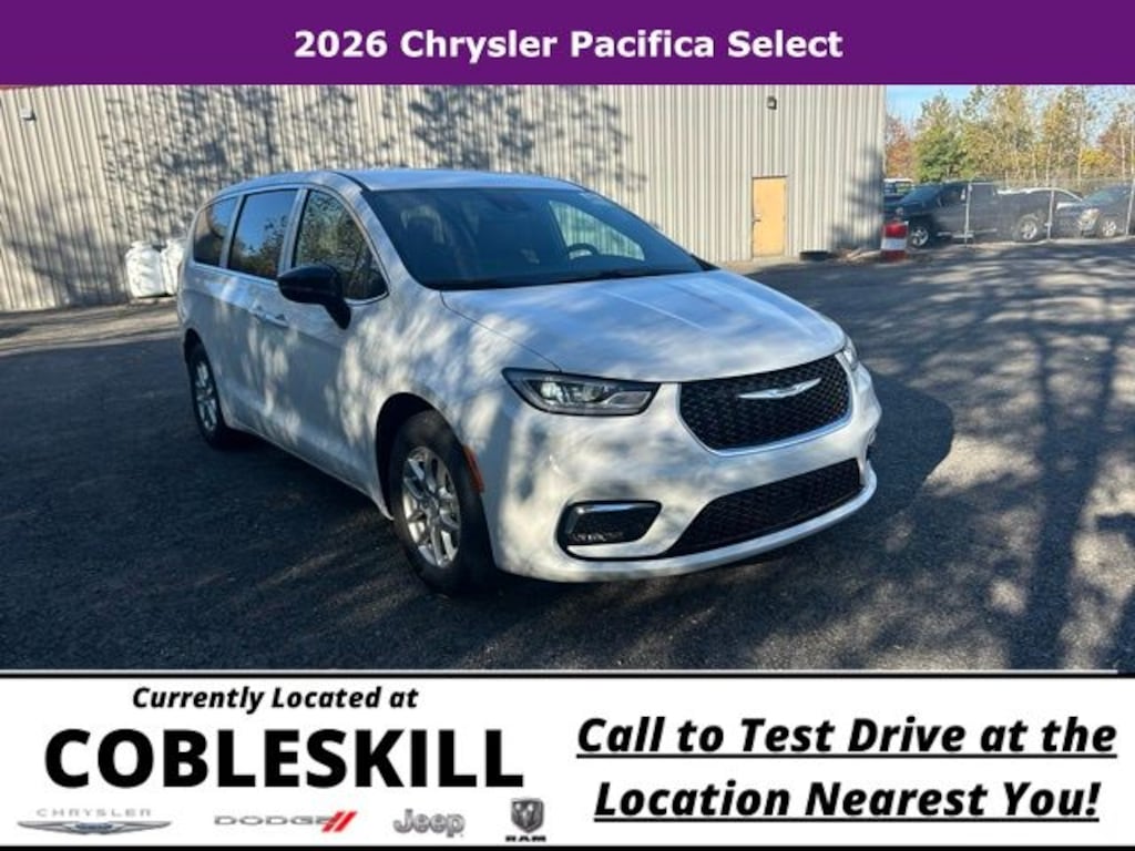 Bright White Clearcoat 2026 Chrysler Pacifica Select FWD 9-Speed 948TE Automatic 3.6L V6 24V VVT Save Time at the Dealership by Customizing your Deal Online!, 10.1" Touchscreen Display, 17" x 7.0" Aluminum Wheels, 3.25 Axle Ratio, 3rd row seats: split-bench, 4-Wheel Disc Brakes, 4G LTE Wi-Fi Hot Spot, 6 Speakers, 8-Passenger Seating, ABS brakes, Air Conditioning, Alloy wheels, AM/FM radio: SiriusXM, Apple CarPlay, Apple CarPlay/Android Auto, Auto-dimming Rear-View mirror, Automatic temperature control, Black Seats, Brake assist, Bumpers: body-color, Caprice Leatherette Bucket Seats, Compass, Connectivity - US/Canada, Delay-off headlights, Disassociated Touchscreen Display, Driver door bin, Driver vanity mirror, Driver's Seat Mounted Armrest, Dual front impact airbags, Dual front side impact airbags, Electronic Stability Control, Emergency communication system: Chrysler Connect, For Details, Visit DriveUconnect.com, Four wheel independent suspension, Front anti-roll bar, Front Bucket Seats, Front dual zone A/C, Front fog lights, Front reading lights, Fully automatic headlights, Garage door transmitter, Google Android Auto, GPS Antenna Input, Heated door mirrors, Heated front seats, Heated steering wheel, Illuminated entry, Integrated Active Noise Cancellation, Integrated Center Stack Radio, Knee airbag, Low tire pressure warning, Memory seat, Occupant sensing airbag, Outside temperature display, Overhead airbag, Overhead console, Panic alarm, ParkView Rear Back-Up Camera, Passenger door bin, Passenger seat mounted armrest, Passenger vanity mirror, Power door mirrors, Power driver seat, Power Liftgate, Power steering, Power windows, Quick Order Package 27L, Radio data system, Radio: Uconnect 5 w/10.1" Display, Rain sensing wipers, Rear air conditioning, Rear reading lights, Rear window defroster, Rear window wiper, Reclining 3rd row seat, Remote keyless entry, Security system, Speed control, Split folding rear seat, Spoiler, Steering wheel mounted audio controls, Tachometer, Telescoping steering wheel, Tilt steering wheel, Touring Suspension, Traction control, Trip computer, Turn signal indicator mirrors, USB Host Flip, Variably intermittent wipers, Voltmeter.