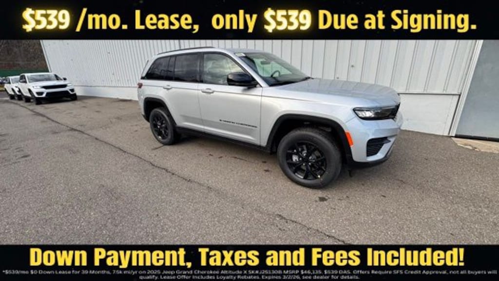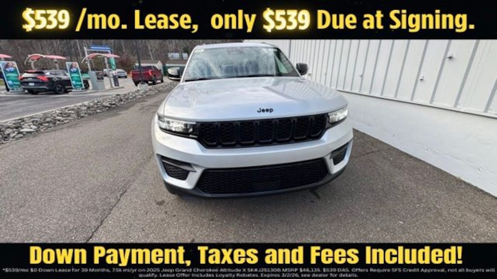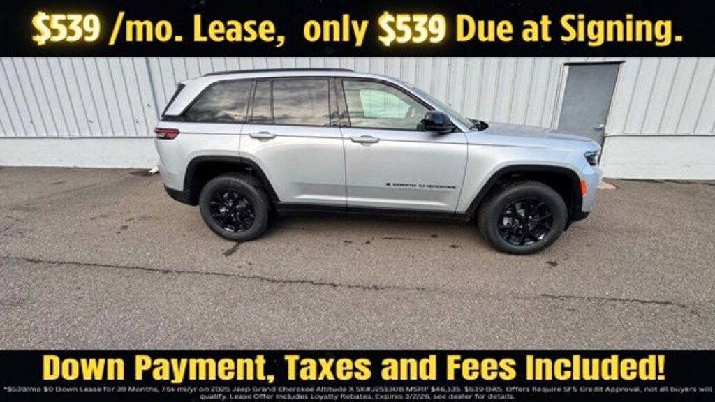 Silver Zynith 2025 Jeep Grand Cherokee Altitude X 4WD 8-Speed Automatic 3.6L V6 24V VVT Save Time at the Dealership by Customizing your Deal Online!, 4WD, 115V Auxiliary Power Outlet, 4-Wheel Disc Brakes, 6 Speakers, ABS brakes, Air Conditioning, Alloy wheels, Altitude X, AM/FM radio: SiriusXM, Anti-whiplash front head restraints, Automatic temperature control, Black Headliner, Brake assist, Bumpers: body-color, Capri Leatherette/Suede Seats, Cloth Seats, Compass, Delay-off headlights, Delete Laredo Badge, Driver door bin, Driver vanity mirror, Dual front impact airbags, Dual front side impact airbags, Electronic Stability Control, Emergency communication system, Four wheel independent suspension, Front anti-roll bar, Front Bucket Seats, Front Center Armrest w/Storage, Front dual zone A/C, Front License Plate Bracket, Front reading lights, Fully automatic headlights, Gloss Black Exterior Accents, Heated door mirrors, Heated Front Seats, Heated Steering Wheel, Illuminated entry, Knee airbag, Low tire pressure warning, Model Year Tracking, Normal Duty Suspension, Occupant sensing airbag, Outside temperature display, Overhead airbag, Overhead console, Panic alarm, ParkView Rear Back-Up Camera, Passenger door bin, Passenger vanity mirror, Power door mirrors, Power driver seat, Power Liftgate, Power steering, Power Sunroof, Power windows, Quick Order Package 23M Altitude X, Radio data system, Radio: Uconnect 5 with 8.4" Display, Rain Sensitive Windshield Wipers, Rear anti-roll bar, Rear reading lights, Rear window defroster, Rear window wiper, Remote keyless entry, Remote Start System, Security system, Selectable Tire Fill Alert, Speed control, Speed-Sensitive Wipers, Split folding rear seat, Spoiler, Steering wheel mounted audio controls, Tachometer, Telescoping steering wheel, Tilt steering wheel, Traction control, Trip computer, Variably intermittent wipers, Voltmeter, Wheels: 17" x 6.5" Fully Painted Aluminum, Wheels: 18" x 8" Fully Painted Aluminum 1, Wireless Charging Pad, 4WD.