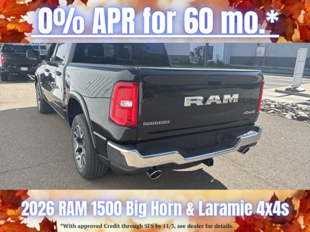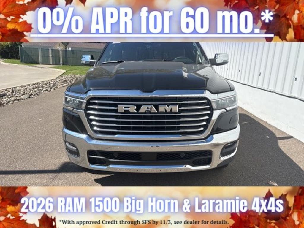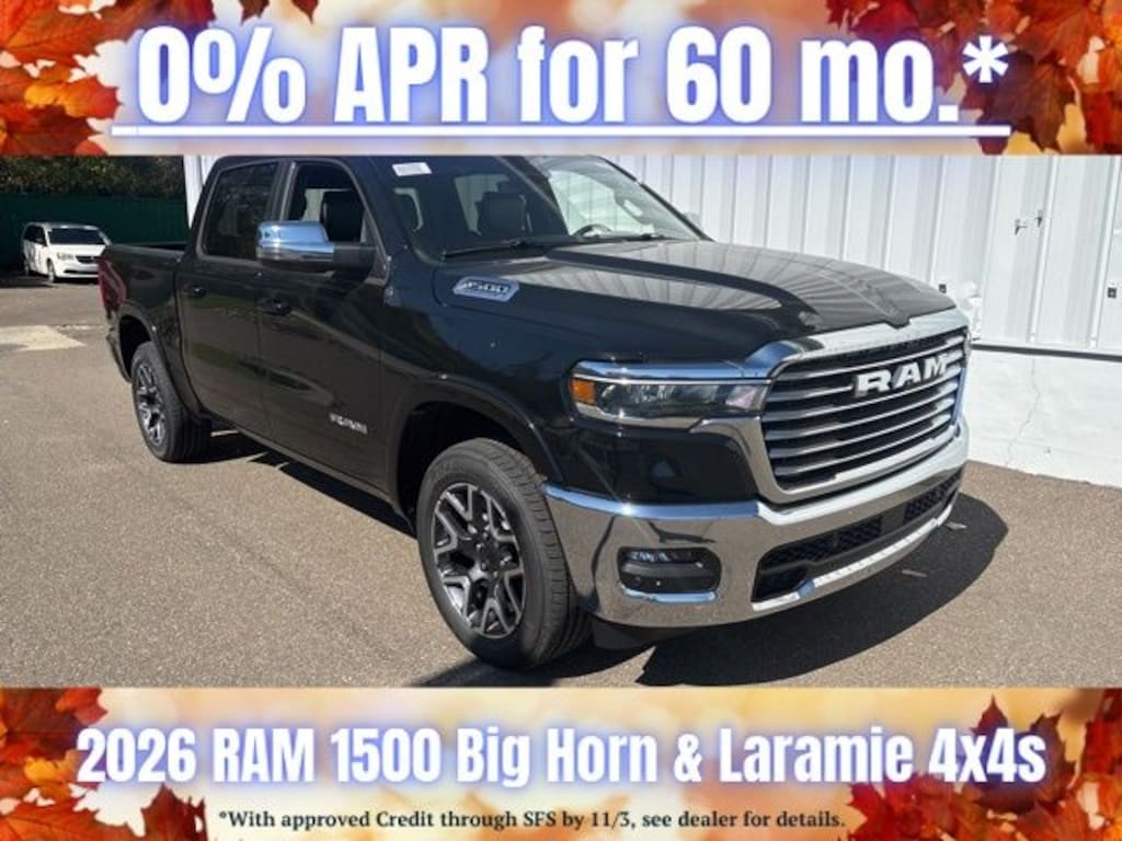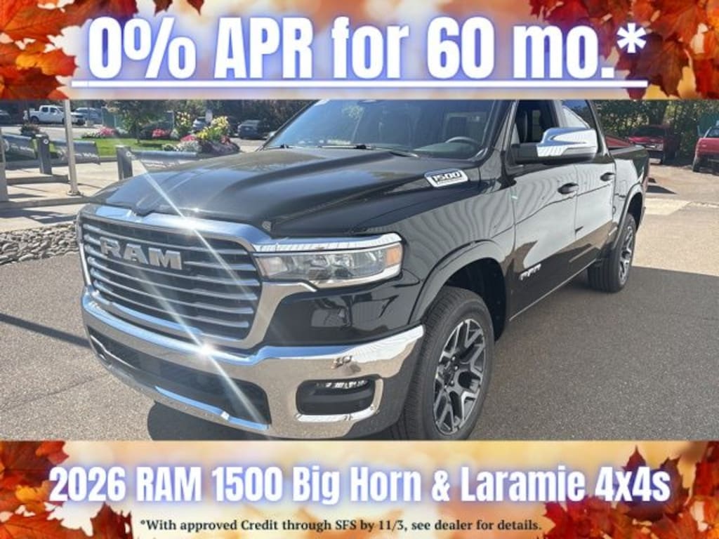Diamond Black Crystal Pearlcoat 2026 Ram 1500 Laramie 4WD 8-Speed Automatic 3.0L I6 Save Time at the Dealership by Customizing your Deal Online!, 10 Speakers, 3.55 Rear Axle Ratio, 4-Wheel Disc Brakes, 4G LTE Wi-Fi Hot Spot, ABS brakes, Active Noise Control System, Air Conditioning, Alloy wheels, AM/FM radio: SiriusXM with 360L, Apple CarPlay, Apple CarPlay/Android Auto, Audio memory, Auto High-beam Headlights, Auto Power-Folding Mirrors, Auto-dimming door mirrors, Auto-Dimming Exterior Driver Mirror, Auto-dimming Rear-View mirror, Automatic temperature control, Brake assist, Bumpers: chrome, Chrome Exterior Mirrors, Compass, Connected Travel & Traffic Services, Connectivity - US/Canada, Convex Wide-Angle Exterior Mirror Insert, Delay-off headlights, Disassociated Touchscreen Display, Driver door bin, Driver vanity mirror, Dual front impact airbags, Dual front side impact airbags, Electronic Stability Control, Exterior Mirrors Courtesy Lamps, Exterior Mirrors w/Heating Element, Exterior Mirrors w/Memory, Exterior Mirrors w/Supplemental Signals, Front anti-roll bar, Front Bucket Seats, Front Center Armrest w/Storage, Front dual zone A/C, Front fog lights, Front License Plate Bracket, Front reading lights, Front wheel independent suspension, Fully automatic headlights, Garage door transmitter, Global Telematics Box Module (TBM), Google Android Auto, GPS Antenna Input, GPS Navigation, HD Radio, Heated door mirrors, Heated front seats, Heated rear seats, Heated steering wheel, Illuminated entry, Integrated Center Stack Radio, Integrated Voice Command w/Bluetooth, Laramie Level 1 Equipment Group, Leather steering wheel, Leather Trimmed Bucket Seats, Low tire pressure warning, Manufacturer's Statement of Origin, Memory seat, MOPAR Front & Rear Rubber Floor Mats, Navigation System, Occupant sensing airbag, Off-Road Information Pages, Outside temperature display, Overhead airbag, Overhead console, Panic alarm, ParkView Rear Back-Up Camera, Passenger door bin, Passenger vanity mirror, Power door mirrors, Power driver seat, Power passenger seat, Power steering, Power windows, Quick Order Package 21H Laramie, Radio data system, Radio: Uconnect 5 Nav w/12.0" Display, Rain Sensitive Windshield Wipers, RAM Grille Badge - Chrome, Rear anti-roll bar, Rear reading lights, Rear seat center armrest, Rear step bumper, Remote keyless entry, Remote Tailgate Release, Secondary Active Grille Shutters, Security system, SiriusXM Radio Service, SiriusXM w/360L, Speed control, Split folding rear seat, Steering wheel mounted audio controls, Tachometer, Telescoping steering wheel, Tilt steering wheel, Traction control, Trip computer, Turn signal indicator mirrors, USB Host Flip, Variably intermittent wipers, Ventilated front seats, Voltmeter, Wheels: 20" x 9" Premium Paint/Polish, Wireless Charging Pad.