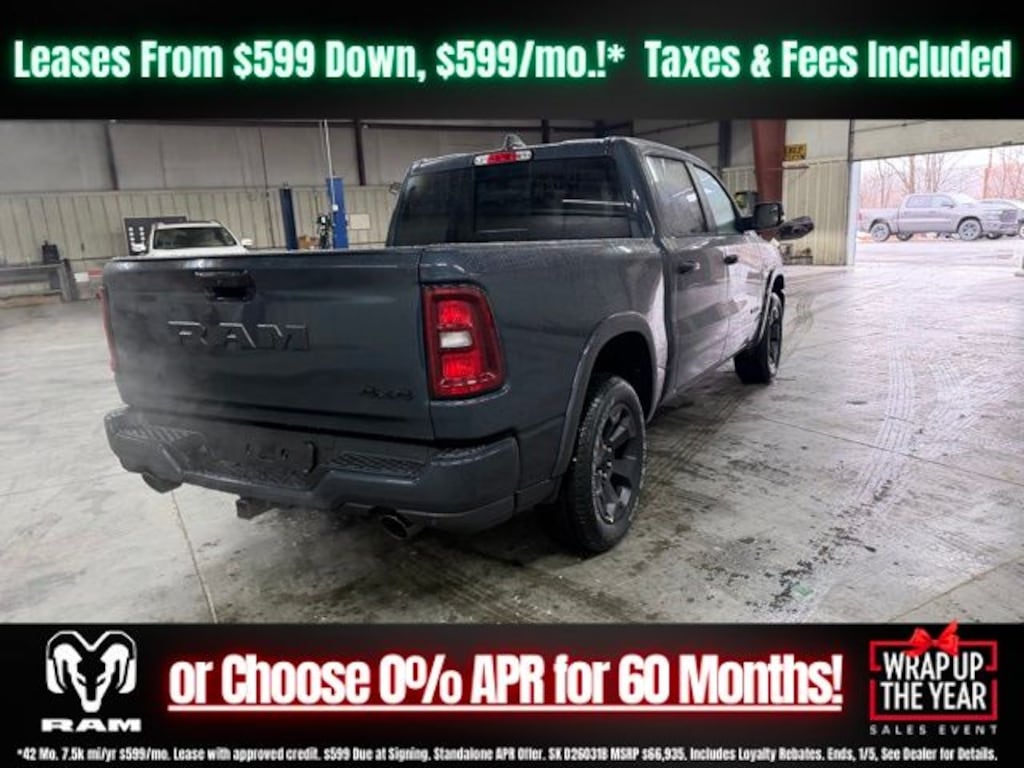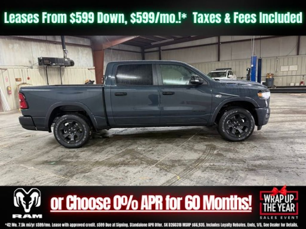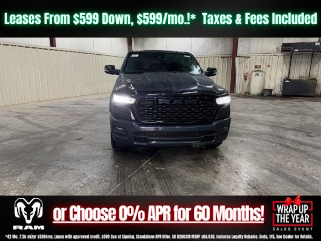 Forged Blue Metallic 2026 Ram 1500 Big Horn/Lone Star 4WD 8-Speed Automatic HEMI 5.7L V8 Multi Displacement VVT eTorque Save Time at the Dealership by Customizing your Deal Online!, 115V Auxiliary Power Outlet, 115V Auxiliary Rear Power Outlet, 12" Touchscreen Display, 2nd Row in Floor Storage Bins, 3 Rear Seat Head Restraints, 33 Gallon Fuel Tank, 4 Way Front Headrests, 4-Wheel Disc Brakes, 400W Inverter, 48V Belt Starter Generator, 4G LTE Wi-Fi Hot Spot, 6 Speakers, 9 Amplified Speakers with Subwoofer, ABS brakes, Accent Color Door Handles, Accent Color Premium Power Mirrors, Accent Color Tailgate Handle, Air Conditioning, Air Conditioning ATC with Dual Zone Control, Alloy wheels, AM/FM radio, Anti-Spin Differential Rear Axle, Apple CarPlay, Apple CarPlay/Android Auto, Auto High-beam Headlights, Auto Power-Folding Mirrors, Auto-Dimming Exterior Driver Mirror, Auto-Dimming Rear-View Mirror, Big Horn Level 2 Equipment Group, Black Exterior Mirrors, Black Exterior Truck Badging, Black Headlamp Bezels, Black Interior Accents, Black Painted Exterior Mirrors Caps, Black Premium Power Mirrors, Black Tail Lamp Bezels, Body Color Fender Flares, Body Color Front Bumper, Body Color Rear Bumper with Step Pads, Brake assist, Bucket Seats, Bumpers: chrome, Center Console Parts Module, Cloth Bucket Seats, Cluster 7.0" TFT Color Display, Compass, Configurable Drive Mode, Connected Travel and Traffic Services, Connectivity - US/Canada, Convex Wide-Angle Exterior Mirror Insert, Delay-off headlights, Deluxe Cloth Bucket Seats, Disassociated Touchscreen Display, Driver door bin, Dual Exhaust with Black Tips, Dual front impact airbags, Dual front side impact airbags, Electronic Stability Control, Exterior Mirrors Courtesy Lamps, Exterior Mirrors with Heating Element, Exterior Mirrors with Supplemental Signals, Front anti-roll bar, Front Bucket Seats, Front Center Armrest w/Storage, Front fog lights, Front License Plate Bracket, Front reading lights, Front Seat Back Map Pockets, Front wheel independent suspension, Full Length Floor Console, Fully automatic headlights, Global Telematics Box Module, Glove Box Lamp, Google Android Auto, GPS Antenna Input, GPS Navigation, Grille Black Surround Black Mesh, HD Radio, Heated door mirrors, Heated Front Seats, Heated Steering Wheel, Illuminated entry, Integrated Center Stack Radio, Integrated Voice Command with Bluetooth, Leather Wrapped Steering Wheel, LED Dome Lamp with on/Off Switch, LED Footwell Lighting, Low tire pressure warning, Manual Adjust 4-Way Driver Seat, Manual Adjust 4-Way Front Passenger Seat, Manual Folding Exterior Mirrors, Media Hub with 2 Charge Only USBs, MOPAR Front and Rear Rubber Floor Mats, Night Edition, Occupant sensing airbag, Outside temperature display, Overhead airbag, Overhead console, Overhead LED Lamps, Panic alarm, ParkView Rear Back-Up Camera, Passenger door bin, Passenger vanity mirror, Power 2-Way Driver Lumbar Adjust, Power Adjust 8-Way Driver Seat, Power Adjustable Pedals, Power door mirrors, Power steering, Power windows, Premium Overhead Console, Quick Order Package 27Z Big Horn, Radio data system, Radio: Uconnect 5 Navigation with 12.0" Display, Radio: Uconnect 5 W with 8.4" Display, RAM Grille Badge - Black, RAM Grille Badge - Chrome, Rear 60/40 Folding Seat, Rear anti-roll bar, Rear Center Armrest, Rear Power Sliding Window, Rear step bumper, Rear Window Defroster, Remote keyless entry, Remote Tailgate Release, Security Alarm, SiriusXM Radio Service, SiriusXM with 360L, Speed control, Steering Wheel Mounted Audio Controls, Sun Visors with Illuminated Vanity Mirrors, Supplier Part Tracking (J-1), Tachometer, Telescoping steering wheel, Tilt steering wheel, Traction control, Trailer Brake Control, Trip computer, Universal Garage Door Opener, USB Host Flip, Variably intermittent wipers, Voltmeter, Wheels: 20" x 9.0" Aluminum Painted Clad.