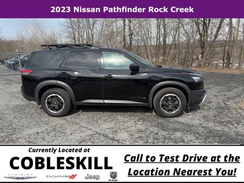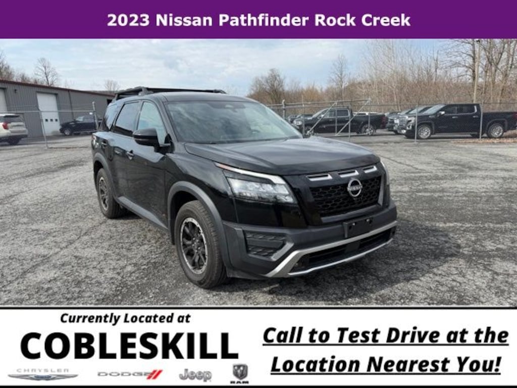Save Time at the Dealership by Customizing your Deal Online!, 4WD, 3rd row seats: bench, 4-Wheel Disc Brakes, 6 Speakers, ABS brakes, Air Conditioning, Alloy wheels, AM/FM radio: SiriusXM, Auto High-beam Headlights, Automatic temperature control, Axle Ratio: 4.334, Black Splash Guards (Set of 4), Brake assist, Delay-off headlights, Driver door bin, Driver vanity mirror, Dual front impact airbags, Dual front side impact airbags, Electronic Stability Control, Emergency communication system: NissanConnect Services, Four wheel independent suspension, Front anti-roll bar, Front Bucket Seats, Front Center Armrest, Front dual zone A/C, Front fog lights, Front reading lights, Fully automatic headlights, Heated door mirrors, Heated Front Bucket Seats, Heated front seats, Illuminated entry, Knee airbag, Leather steering wheel, Leatherette Seating Surfaces, Low tire pressure warning, NissanConnect featuring Apple CarPlay and Android Auto, Occupant sensing airbag, Outside temperature display, Overhead airbag, Overhead console, Panic alarm, Passenger door bin, Passenger vanity mirror, Power door mirrors, Power driver seat, Power steering, Power windows, Radio data system, Radio: AM/FM Audio System w/NissanConnect, Rear air conditioning, Rear anti-roll bar, Rear Parking Sensors, Rear reading lights, Rear side impact airbag, Rear window defroster, Rear window wiper, Reclining 3rd row seat, Remote keyless entry, Rock Creek AS Floor Liners & Cargo Area Protector, Rock Creek Roof Rack, Roof rack, Security system, Speed control, Speed-sensing steering, Split folding rear seat, Spoiler, Steering wheel mounted audio controls, Tachometer, Telescoping steering wheel, Tilt steering wheel, Traction control, Trip computer, Turn signal indicator mirrors, Variably intermittent wipers, Wheels: 18" Beadlock Styled Design, 4WD. Priced below KBB Fair Purchase Price! 2023 Nissan Pathfinder 4D Sport Utility Rock Creek 4WD 9-Speed Automatic V6 Super Black