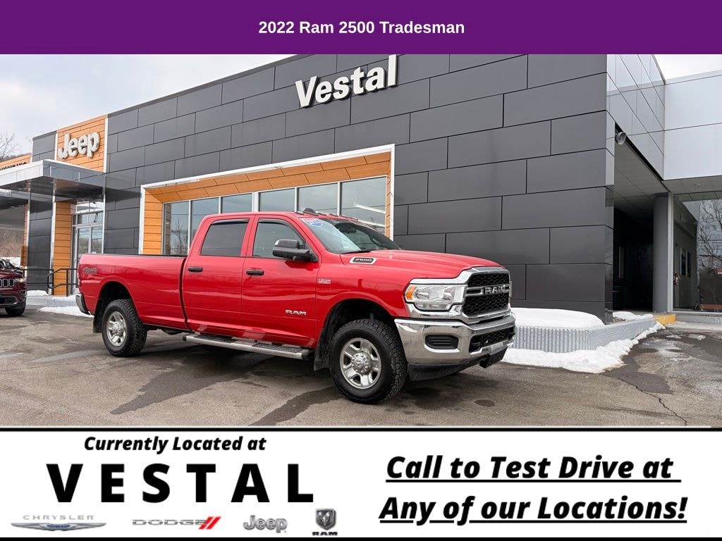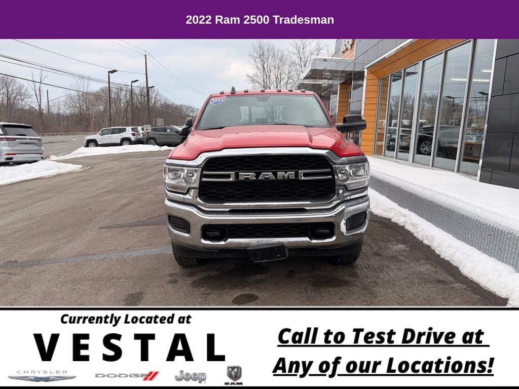 17" x 7.5" Steel Styled Wheels, 2 Way Rear Headrest Seat, 220 Amp Alternator, 3.73 Axle Ratio, 4 Way Front Headrests, 4-Wheel Disc Brakes, 40/20/40 Split Bench Seat, 4G LTE Wi-Fi Hot Spot, 6 Speakers, 8.4" Touchscreen Display, ABS brakes, Active Noise Control System, Air Conditioning, All R1 Low Radios, All Radio Equipped Vehicles, AM/FM radio, Anti-Spin Differential Rear Axle, Apple CarPlay, Black Exterior Mirrors, Bluetooth, Bluetooth Handsfree Phone & Audio, Brake assist, Bright Front Bumper, Bright Rear Bumper, Carpet Floor Covering, Center Hub, Chrome Appearance Group, Chrome Grille Surround, Clearance Lamps, Cloth 40/20/40 Bench Seat, Cluster 3.5" TFT Color Display, Compass, Connectivity - US/Canada, Dash Pass Thru Wire Circuits, Delay-off headlights, Driver door bin, Dual front impact airbags, Dual front side impact airbags, Electronic Stability Control, Electronically Controlled Throttle, Emergency communication system: SiriusXM Guardian, Exterior Mirrors Courtesy Lamps, Exterior Mirrors w/Heating Element, Exterior Mirrors w/Supplemental Signals, For Details, Visit DriveUconnect.com, Front anti-roll bar, Front Armrest w/Cupholders, Front Center Armrest w/Storage, Front License Plate Bracket, Front Performance Tuned Shock Absorbers, Front reading lights, Fully automatic headlights, Global Telematics Box Module (TBM), Google Android Auto, GPS Antenna Input, Heated door mirrors, Heavy Duty Vinyl 40/20/40 Split Bench Seat, Hill Descent Control, I/P Mounted Auxiliary Switches, Illuminated entry, Integrated Center Stack Radio, Integrated Voice Command w/Bluetooth, LED Bed Lighting, Low tire pressure warning, Manual Adjust 4-Way Driver Seat, Manual Adjust 4-Way Front Passenger Seat, Manufacturer's Statement of Origin, Matte Black Mesh Grille w/Chrome, Mirror Running Lights, MOPAR Front & Rear Rubber Floor Mats, Occupant sensing airbag, Off Road Decal, Off Road Package, Outside temperature display, Overhead airbag, Overhead console, ParkView Rear Back-Up Camera, Passenger door bin, Passenger vanity mirror, Power Adjust & Heated Black Tow Mirrors, Power door mirrors, Power steering, Power windows, Quick Order Package 2GA Tradesman, Radio data system, Radio: Uconnect 3 w/5" Display, Radio: Uconnect 5 W w/8.4" Display, Rear anti-roll bar, Rear Backup Alarm, Rear Folding Seat, Rear Performance Tuned Shock Absorbers, Rear Power Sliding Window, Rear step bumper, Rear Wheelhouse Liners, Rear Window Defroster, Selectable Tire Fill Alert, SiriusXM Radio Service, SiriusXM Satellite Radio, Snow Chief Group, Speed control, Storage Tray, Tachometer, Tilt steering wheel, Tip Start, Tow Hooks, Traction control, Tradesman Level 2 Equipment Group, Trailer Brake Control, Trailer Light Check, Trailer Tow Mirrors, Variably intermittent wipers, Wheels: 18" x 8.0" Steel Chrome Clad. 2022 Ram 2500 4D Crew Cab Tradesman Flame Red Clearcoat 4WD 8-Speed Automatic 6.4L V8